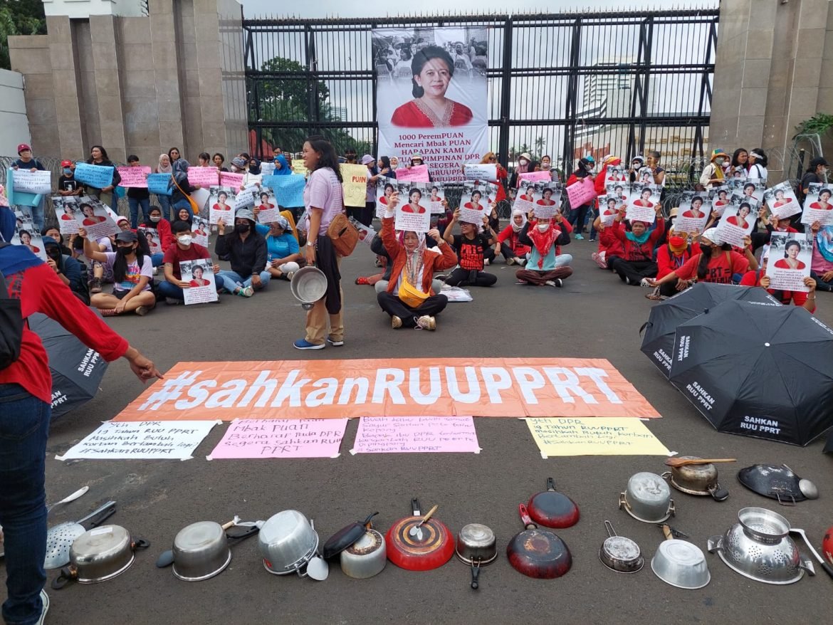 tungkumenyala.com – Bertepatan dengan Hari Perempuan Internasional yang jatuh pada Rabu 8 Maret 2023, para aktivis perempuan menggelar aksi bertajuk “1000 Perempuan Mencari mbak Puan” di depan Gedung DPR, Senayan jakarta. Mereka mendesak agar Rancangan Undang-undang Perlindungan Pekerja Rumah Tangga (RUU PPRT) bisa segera disahkan.