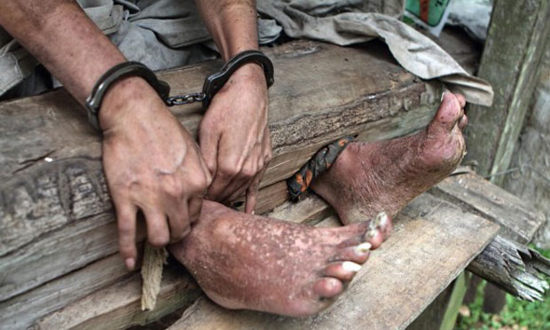 Tanpa dukungan atau kesadaran kesehatan mental, keluarga atau institusi sering membelenggu orang yang bertentangan dengan keinginan mereka, meninggalkan mereka makan, tidur, buang air kecil dan buang air besar di satu tempat kecil, kata pengawas hak asasi manusia itu dalam sebuah laporan.